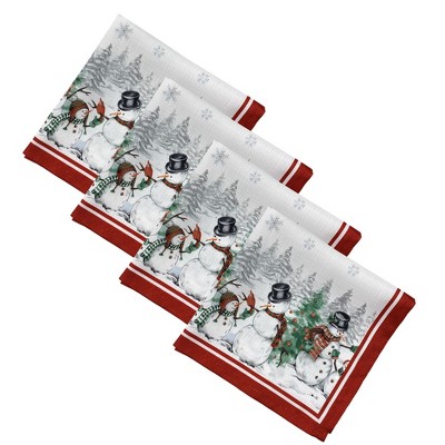 The Snowman Winterland Holiday Snowflake printed tablecloth brings a festive, nostalgic look to your table setting throughout the Christmas and holiday season. Holiday inspired, decorated with snowmen wearing black hats and plaid scarves, red cardinals, snow covered green pine trees, and star shaped snowflakes. Features a soft white ground with a classic red bordered design. Excellent for special occasions, events, parties, family gatherings and everyday use during the winter months and holiday season. Soft and durable fabric can be ironed to release stubborn creases and make your tablecloth wrinkle free. Hemmed edge adds a finished look and prevents wear and tear. Available in a large selection of table shapes and sizes including square, rectangle and round to fit all your entertaining needs. 100% Polyester. Easy care, machine washable. Coordinate to Snowman Winterland Holiday Snowflake napkins, placemats and table runner to complete the look.