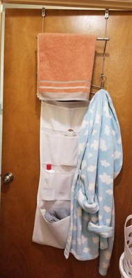 - Over-the-door bath organizer conveniently holds bath towels, robes, slippers and more and keeps them close by but out of the way