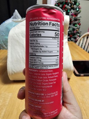 carbonated water, organic tangerine juice, organic raspberry juice, organic grape juice, natural flavor, electrolytes (sodium citrate, potassium citrate, citric acid), organic green tea extract, pyridoxine hydrochloride (vitamin b6), vitamin b12' '