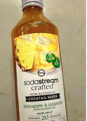 SodaStream Crafted Mixers are new, non-alcoholic cocktail mixers that make it easy to make your own cocktails & mocktails at home. Simply add to your sparkling water (and a spirit if you wish). Pineapple & Jalapeno is a unique blend of tropical pineapple and jalapeno to fire up your taste buds.