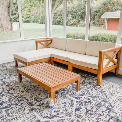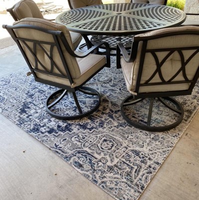 This is a beautiful rug! However it looks different from the pic on Target. It has gray, taupe, navy and a touch of aqua. It’s also soft for an outdoor rug. We love it! My beige cushions look good but I’m replacing them with light gray.