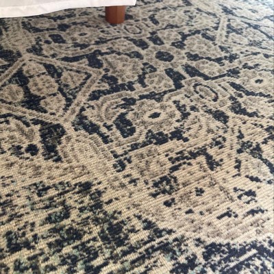 A: The rug features a distressed, modern medallion design with a matching border.