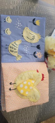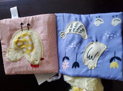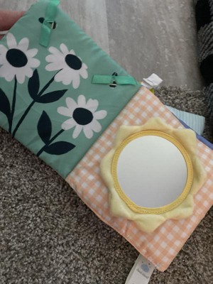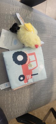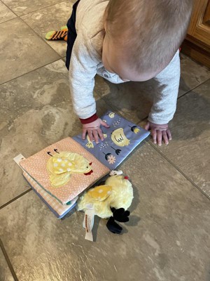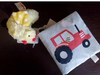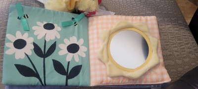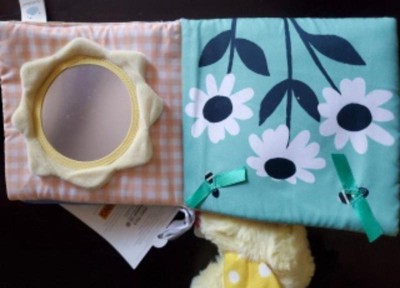 The cutest little baby play book ever! I love that it crinkles and makes sounds! It also has a perfect sized mirror in it for baby to look at themselves! It has super cute little flap opens even one of the pages has a little squeaker!. Extra soft and the little chick that comes with it is so soft and adorable!!