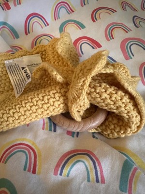 This Soft Knit Security Blanket with Wood Ring Mustard Yellow from Hearth & Hand with Magnolia is cute & soft but I could see the knit aspect being snagged easily by baby or nearby objects. The wood ring is soft/ smooth, so no splinter concerns. The knit blanket is truly soft & it's a beautiful mustard color in person.