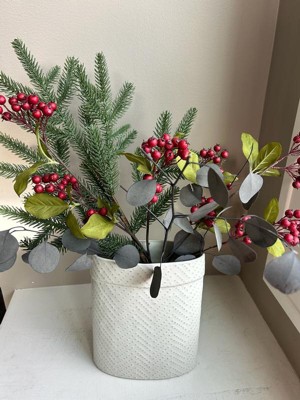 [This review was collected as part of a promotion.] Love this pine faux stem to add to my winter entryway arrangement! Color is bright and material is durable so should last many years. Easy to add into variety of arrangements for holidays or winter season.