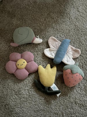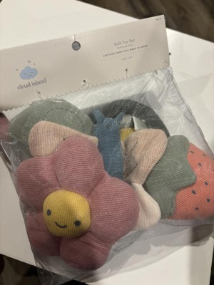 Give your little one fun and cute options for play every day with the 5-Piece Soft Toy Set from cloud island™. This set of five soft toys includes a flower, butterfly, strawberry and other toys for fun options. Made with soft fabric, the toys squeak and rattle to focus on their sensory development.