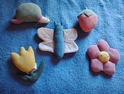 They are very cute cloth (non plastic 🙌)rattle toys for babies. Perfect for spring and summer. I wish they had more attachment options to clip so they don’t fall as often but they’re fun and help distract my kid for a bit.