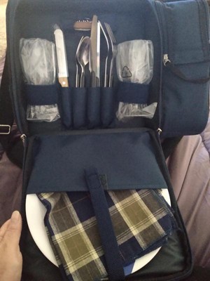 [This review was collected as part of a promotion.] This picnic cooler is so awesome. I love that it can keep our food cold and it has tools to eat with. It has everything you need cups, plates. forks and napkins. it makes traveling with food so much easier.