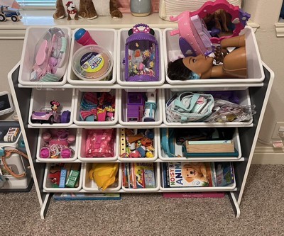 I have a 2 1/2 yr old and a 7 month old and the majority of our time is spent in our living room so naturally most of our toys are there. I had things in buckets or piles in the corner of our living room. It was driving me nuts! I like being organized, it gives me a sense of calm. I was looking for some sort of toy storage that was functional, pleasing to the eye and easy for my kids to take toys in and out. We got the 16 bin toy storage organizer and it is perfect. It was easy to put together and the construction is sturdy (it comes with wall mount supplies if you want to secure it to your wall). All my kids toys now have a bin to go in to and it has helped open up more floor space. My 2 1/2 yr can easily reach all the bins to take toys out. She actually “helped” me put the toys in to the bins when we first got it. I would (and will) definitely recommend this product.