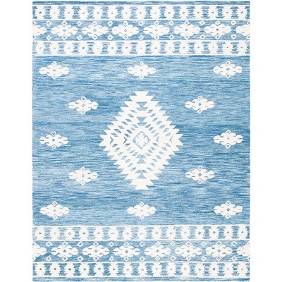 Elevate your living space with our exquisite hand tufted rug, artfully crafted in India. This stunning 6 X 9 medium rectangle area rug boasts a luxurious mingling of wool and viscose, offering both durability and a gentle sheen that catches the light beautifully. The brilliant blue and soft ivory hues create a serene foundation, while the unique pattern speaks to a sophisticated aesthetic.