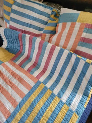 The Sol Stripe Reversible Quilt Set by Levtex Home is inspired by bright fun summertime colors . Offered in classic red, yellow, orange and blue, this design will immediately transform your bedroom. This reversible quilt features a collection of striped patches in bright colors on the front, reversing to a blue and white stripe on the back. The Quilt and Sham have a cotton front and back, filled with a cotton-rich filler, and are machine washable. Enjoy this for years to come!