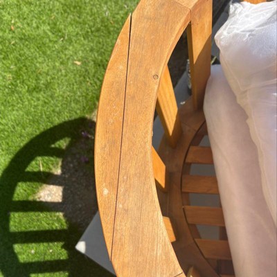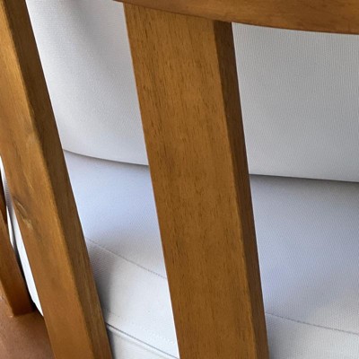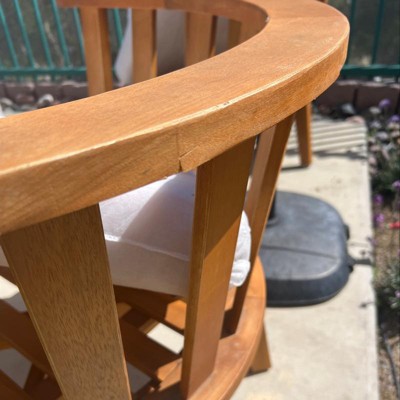 Several parts of the set we bought were broken, Target sent replacement sets. The wood is weak and the legs broke on the love seat within 3 uses. Target said it was outside the return window and refused to refund. None of the chairs are fit for purpose. The slats under the cushions break easily. Even covered the wood finish has flaked. Worst outdoor chairs we ever bought.