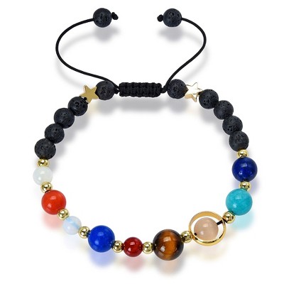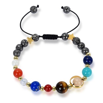 Solar System Natural Stone Beaded Adjustable Bracelet Wear this intricately designed bracelet displaying the solar system. By wearing the bracelet your wrist symbolizes the sun and everything else is surrounding it. The adjustable bracelet features vibrant gemstones each depicting a part of our solar system. By wearing this bracelet you can release positive and powerful energy to everyone around you. The sliding knot allows the bracelet to adjust to larger sizes comfortably around your wrist. This adjustable bracelet has a starting length of 7.25 inches and can adjust up to 1.5 inches per side. The inner circumference at its tightest is 6.25 inches. The width of the back beads is 6 millimeters and the weight is 13 grams. The shocker tie slide clasp allows the bracelet to adjust up to 1.5 inches per side. To do so, pull on the bead ends to loosen the bracelet, and pull on the knot end to tighten the bracelet. The natural stones color may vary slightly from pictured. The bracelet uses your wrist as the sun, and the stones represent the eight planets of our solar system along with Earth's moon. Wear this bracelet alone or pair it with other accessories to create your own look. The back beads are available in 4 options, which are Sandstone beads, Black Lava, White Lava and Gunmetal coated Lava.