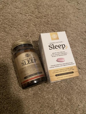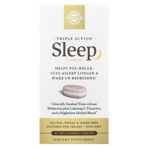 Clinically studied time-release melatonin plus calming l-theanine, and a nighttime herbal blend. 3 benefits in one pill Benefit 1: Calming l-theanine, combined with a blend of nighttime herbs chamomile, lavender, lemon balm and valerian root extracts, to help you relax and unwind. Benefit 2: Quick release melatonin helps you fall asleep fast. Benefit 3: Clinically studied time-release melatonin works with your body's natural sleep cycle to help you stay asleep. A great night's sleep. A great day. They really go hand-in-hand. But, a restful night's sleep isn't always easy to get. Sleep aids can help you fall asleep. But, how many of them help you stay asleep and wake up feeling refreshed? Now there's one product that helps you get a good night's sleep three ways: Solgar® Triple action sleep. Solgar® Triple action sleep leverages clinically studied time-release technology that allows each tablet layer to... dissolve at different times throughout the night. So it helps you relax... Get a good night's sleep... and wake up ready to take on the day! Melatonin plays a vital role in the maintenance of circadian rhythm "sleep-wake cycle", sleep induction and sleep duration. L-Theanine interacts with the neurotransmitter GABA, to support a calm and relaxed mood. Our nighttime herbal blend includes chamomile, lavender, lemon balm and valerian root extracts.