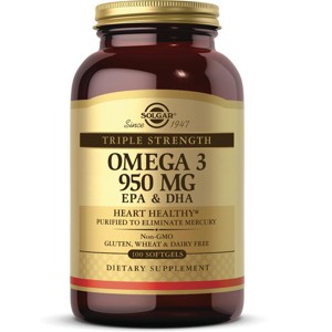 Triple-Strength Omega 3 950 mg EPA & DHA from Solgar is their highest concentration of the natural omega 3 polyunsaturates EPA and DHA from cold water fish. Promotes heart, joint, skin and immune health. Molecularly distilled to remove mercury and other harmful contaminants. Free of gluten, wheat, dairy, sugar, yeast, sodium, artificial flavor, sweetener, preservatives and color. 100 softgels. These statements have not been evaluated by the Food and Drug Administration. This product is not intended to diagnose, treat, cure, or prevent any disease.