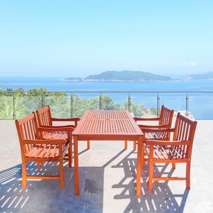 - With this Quentin 5-piece Reddish Brown Hard Wood Patio Dining Set, make room for upcoming dinner parties, leisurely summer cocktails, and the maximization of fresh breezes!