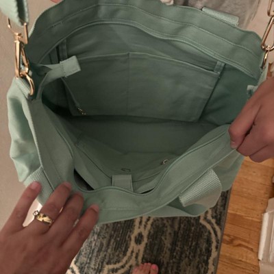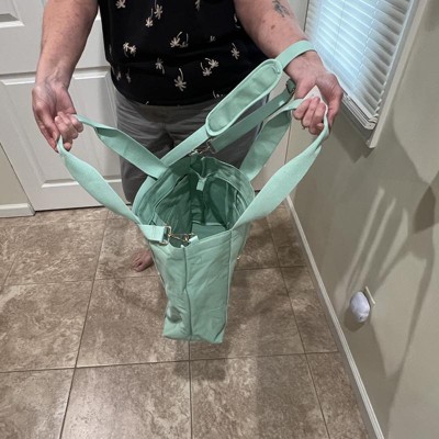 [This review was collected as part of a promotion.] I purchased this tote bag online. I love the color of this bag! It's a great bag to carry around for summer. It holds a ton and I can use it for an every day bag, or fill it up for a day at the pool or the beach. There are lots of compartments and pockets, including a pocket to hold my water bottle. The material is like a vinyl type canvas that's easy to wipe clean if it gets a little dirty. It can be worn as a shoulder bag or as a crossbody. The long strap is detachable. Great price for a beautiful bag! I received an incentive to write this review.