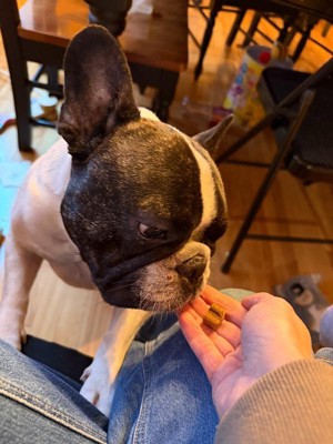 [This review was collected as part of a promotion.] These are more like treats than anything. My pup absolutely loves them. He’s had allergy issues his whole life, super itchy skin, redness, flakiness, paw licking. I really think these help him. At the very least he loves the flavor and munches down on them. The texture is easy enough for my old boy to chew on with the few teeth he has left. They are crumbly and smell like a chicken treat. Love the dosage size. So easy to administer.
