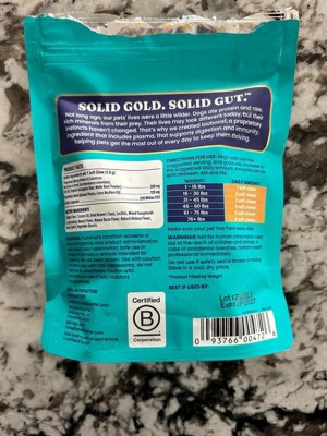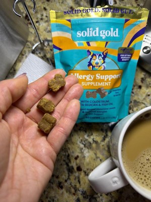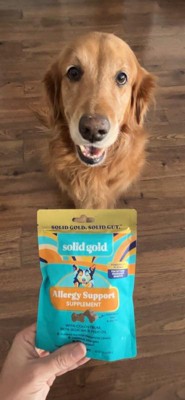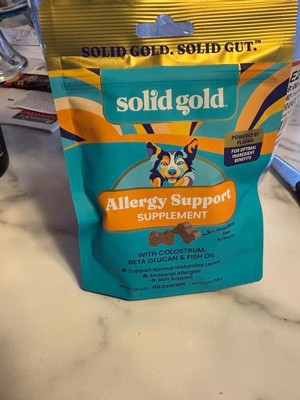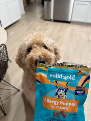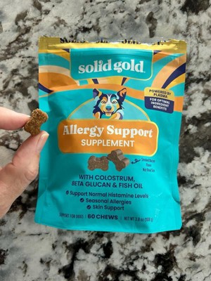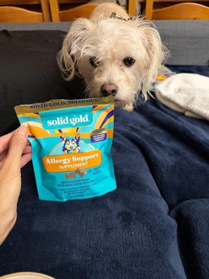 [This review was collected as part of a promotion.] My dog has terrible skin allergies, with itching and scratching all year long. We’ve tried several allergy treatments, from prescription pills to baths to sprays, and nothing has helped as much as these treats! She looks forward to eating them each day, and I can see a real difference in her skin. She is a picky eater, and these treats quickly became some of her favorites so they must taste really good! I will buy these for her in the future because they have really helped her skin and coat. And look at that face - how could I resist making her happy?! Thank you to Influenster and Solid Gold for the chance to sample this free product.