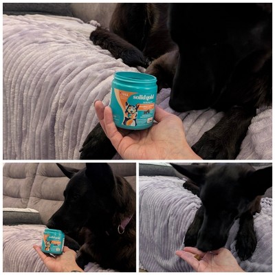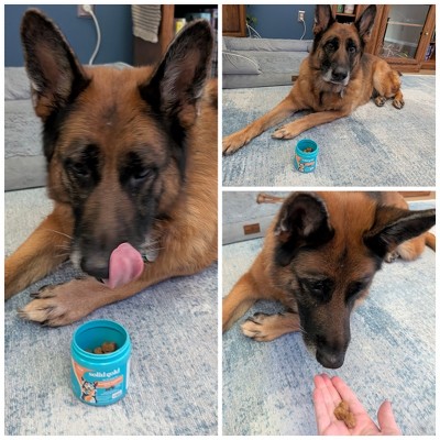 [This review was collected as part of a promotion.] I was given a sample to try in exchange for an honest review. I was excited to try them with my bigger dog (45 lbs) as he has very dry/itchy skin. He often will rub his body along our furniture to scratch at itchy spots, and also frequently develops hot spots from licking/chewing at itchy spots. My dog seemed to love the flavor of the treats and ate them without any fuss then asked for more. As we used the treats, I noticed that his skin started to feel less dry to the touch and he wasn't rubbing himself along the furniture nearly as much, and I haven't noticed any new hot spots from chewing/licking while he's been on the product. I think overall the supplements definitely helped ease some of his symptoms, and I am planning to buy them again for him.