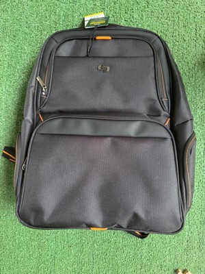 Ambition Travel Backpack with fully padded 17.3" laptop compartment. Internal iPad® or tablet pocket. Two front pockets. Front zip-down organizer section. Side zippered pockets for accessories or water bottle. Discrete back pocket for added security. Back straps slides over luggage handle. Padded back and adjustable backpack straps. Oranger interior lining and 27L capacity.