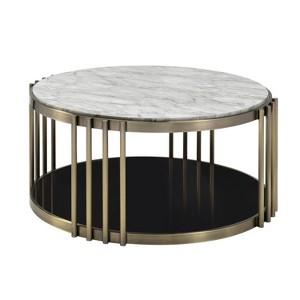 Enveloped in an alluring antique brass-plated steel frame, this exquisite coffee table elegantly showcases a sumptuous faux white marble tabletop, accented by a striking black tempered glass base. The harmonious interplay of these contrasting yet complementary materials captures the essence of sophisticated elegance, elevating the aesthetic of any living space. Far more than a mere visual feast, this table also offers unparalleled functionality. Utilize its chic black glass base as an additional shelf space—perfect for elegantly displaying cherished books, artisanal decor, or mementos—infusing a touch of finesse and practicality to your sitting room or lounge area.