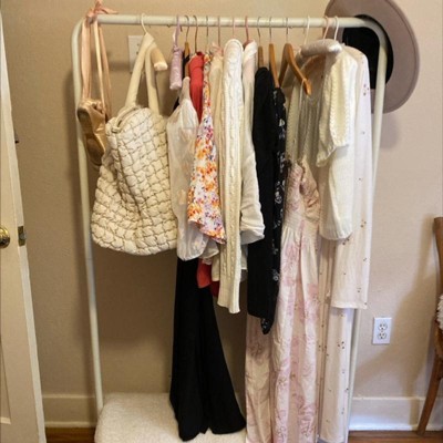 Love the look and function of this clothing rack. Loved the shelf and hanging space. I didn’t like the color of the gold. It was a dull and not bright gold. Returned because of the color.