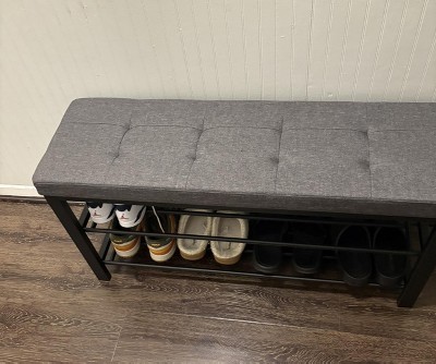 Instead of hopping around on one leg trying to put on shoes, why not sit comfortably on this shoe bench to lace up? With a padded seat and 2 shelves, this SONGMICS shoe bench will never let you down!Rescue Your Disorganized Entryway: 2 tiers of lengthened shelves accommodate about 10 pairs of shoes and help restore a neat entryway. The cushioned seat with a breathable linen cover offers a comfortable seat for changing shoes.Stable Shoe Bench: Bolstered by a sturdy metal frame, this shoe rack can hold your purse and handbag in your entry and corral your most commonly worn shoes of the season in your bedroom or cloakroom, or just about anything else you throw its way.