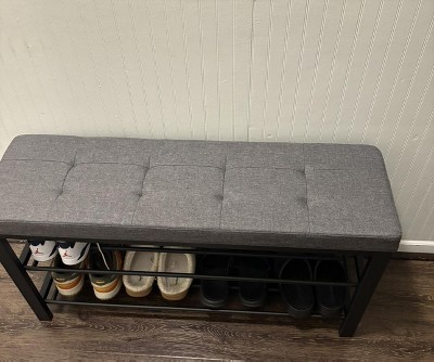 Instead of hopping around on one leg trying to put on shoes, why not sit comfortably on this shoe bench to lace up? With a padded seat and 2 shelves, this SONGMICS shoe bench will never let you down!Rescue Your Disorganized Entryway: 2 tiers of lengthened shelves accommodate about 10 pairs of shoes and help restore a neat entryway. The cushioned seat with a breathable linen cover offers a comfortable seat for changing shoes.Stable Shoe Bench: Bolstered by a sturdy metal frame, this shoe rack can hold your purse and handbag in your entry and corral your most commonly worn shoes of the season in your bedroom or cloakroom, or just about anything else you throw its way.