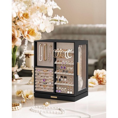 - 3 side drawers for hanging your necklaces and pendant earrings to avoid tangling and for storing rings, stud earrings, bracelets, or watches; the top tray and the bottom drawer offer storage for pins, hair pins, or other accessories
