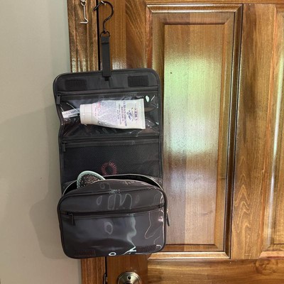 [This review was collected as part of a promotion.] This women’s travel case for toiletries is very convenient. It folds up nicely and can fit in any travel bag in a compact manner. When you open it up, it has a hook on the top that swivels so you can hook it onto almost anything to have easy access in viewing of your items. This includes a mesh zipper portion, as well as a clear, plastic, zipped portion and a larger zipped compartment at the bottom. I received an incentive to write this review.
