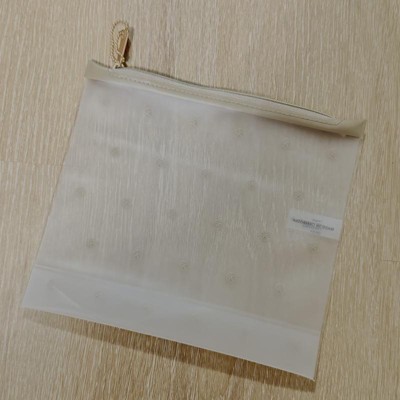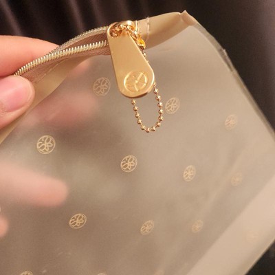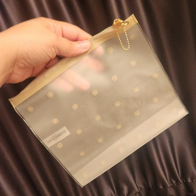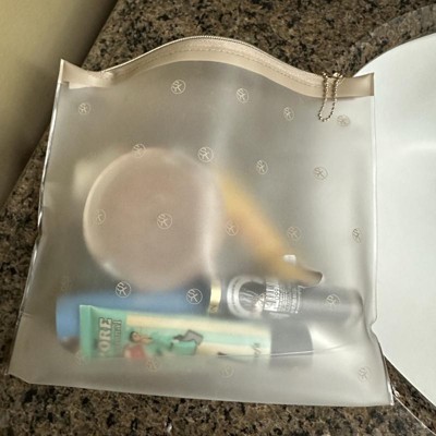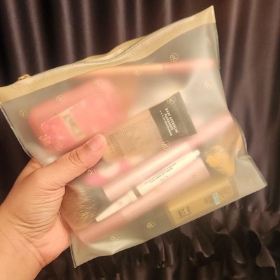 [This review was collected as part of a promotion.] This cosmetic travel pouch, made out of TPU is perfect for makeup, hair, and skincare products. It is 7.25 in x 8.5 in in size and I felt like it held a decent amount of my skin care products. It is clear with the brand logos all over it. I also like the gold zipper detail. This is easy to wipe clean and would also serve well as a waterproof bag. I highly recommend this bag. The quality was also decent for the price point. I received an incentive to write this review.