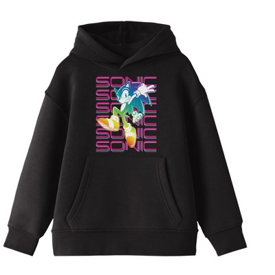 Get up to speed with this Sonic the Hedgehog sweatshirt. The hoodie features a multi-colored Sonic flashing a peace sign while neon purple letters behind him repeat his name. The sweatshirt comes in black with a double-lined hood and a large pouch pocket. Sonic fans will love this fun design.