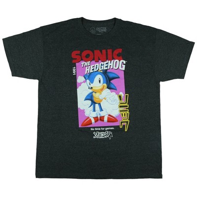Vibrant Design: This tee features a bold print of Sonic standing inside a bold purple square with a large "Sonic The Hedgehog" logo above. Text beneath reads "No Time For Games," giving this graphic shirt a standout style