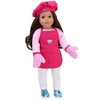 - DESINGER DETAILS: The embroidered cupcakes on the apron and baker’s hat are beyond cute, and the hot pink trim on the light pink gingham oven mitts perfectly matches the rest of the set, tying the look together. A large front pocket keeps doll cooking tools close at hand.