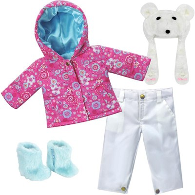 [This review was collected as part of a promotion.] I got this darling 18" Doll Sophie's Print Parka, White Snowboard Pants and Aqua Fur Boots and Hot Pink Polar Bear Hat for my niece and she absolutely loves it. It fits her doll perfectly and the quality is wonderful with bright, vibrant colors. I highly recommend. You won't be disappointed!