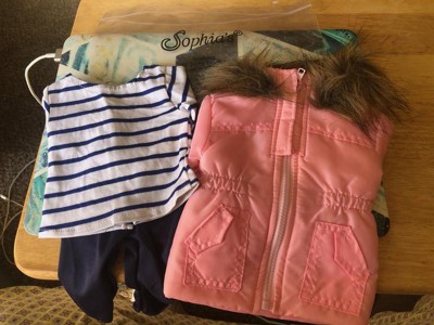 [This review was collected as part of a promotion.] I am truly impressed with the quality and cuteness of this 3 piece doll outfit. It fits an 18" doll perfect and really dresses up the doll. The material is really soft and well made; no need to worry about it coming apart easily. The jacket is so adorable with the pink coloring and the fur around the hood. I really like how the zipper on the jacket really works and is able to help teach my little ones motor skills that they are able to apply to their daily routines. I would definitely recommend this 3 piece doll outfit to anyone with little ones that love to change their dolls clothing and look cute as you will not be disappointed by this set.