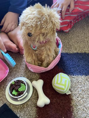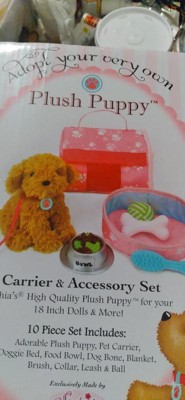 - Includes a 6.5" plush puppy dog, collar, leash, food bowl, brush, toy ball, toy bone, puppy bed, blanket, and carrier all packaged into a cute decorative box