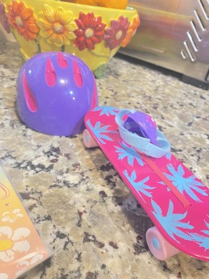- INCLUDES: Colorful palm-patterned skateboard with working wheels - measures 8 x 2.5 x 1 inches - coordinating helmet, knee pads and stickers for a completely cool - and safe! - look.