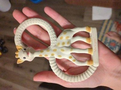 Perfect for stroller or traveling. Instead of risk losing the big Sofie, I bought this “travel size” one I can attach to the stroller or easily hold onto if we’re on a plane. The rings and ridges are perfect for teething babies. No rubber smells with ours like ours have noted.