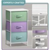 - KID FRIENDLY DESIGN — Sleek vertical storage — Made with strong steel frame and durable MDF wood top with smooth white finish — Pastel Colors: Purple/Aqua/Teal — Made of non-woven fabric — Wipe clean — Minimal assembly required — Hardware and instructions INCLUDED — Measures approximately 17.75” L x 11.87” W x 28.75” H