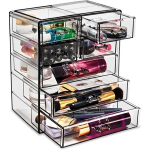 Whether you're a beauty beginner or glam guru, you now have a place to display your essentials. This 3-piece makeup organizer by Sorbus is a stylish way to store your beauty collection. It features six drawers total (both small and large) with a sleek clear view. The top tray compartment includes sixteen slots, perfect for dividing your makeup brushes, lipsticks, perfume bottles, skincare, and more. With an interchangeable design, this entire unit can remain stacked together or separated to spread out your collection. Don't limit your imagination to beauty needs! Grooming tools, jewelry, and other personal accessories can be beautifully organized within this storage case.