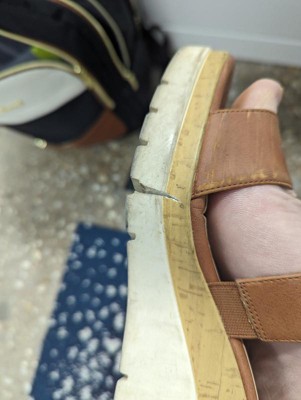 We are so sorry to hear that your Goodtimes wedge sandals aren't holding up as expected. We understand your concern. We may have options for you regarding the shoes, if you could please contact us so we can go over those with you. You can send a message at https://naturalizerca.custhelp.com/app/ask or call our Naturalizer.ca Consumer Care Department at 1-800-727-3036. The Call Center hours of operation are Monday-Friday 9:00a.m.-6:00p.m. and Saturday 10:00a.m.-5:00p.m. CT. We appreciate your review and we have forwarded your comments to our design team. Thank you for your feedback.