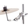 The attachment features a 10.5mm adjustable eye-bolt clamp with an L-rod cymbal arm on one end and a grabber clamp on the other. Attaches to any 1/2" to 1-1/2"-diameter tube.
