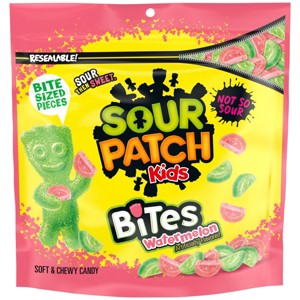 Enjoy a sour twist on your favorite summer flavor with SOUR PATCH KIDS Bites Watermelon Soft & Chewy Candy. These bite-sized chewy candies pack a summery, mouth-puckering watermelon flavor into a mini, ultra-munchable watermelon shape to add excitement to your candy snacking experience. A fat free food, this sour candy is the perfect sweet end to your day. Keep this fruit flavored candy on hand for a quick sour treat, as a fun dessert topper or as party favors for Halloween, Valentine's Day or birthdays. SOUR PATCH KIDS sour watermelon candy also makes a great movie theater candy to snack on during your favorite flick. Share this bagged candy or stash it in desk drawers, lockers or backpacks for sour candies on-the-go. Each package of fruit candy is resealable to ensure the sour candies stay soft, chewy and full of watermelon flavor.