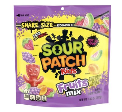 - One 11.03 oz share size bag of SOUR PATCH KIDS Fruits Mix Soft & Chewy Candy