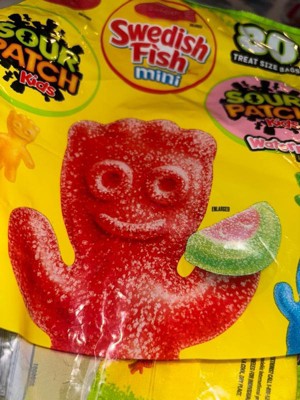 - 80 treat-size snack packs, of SOUR PATCH KIDS and SWEDISH FISH Mini Soft & Chewy Candy