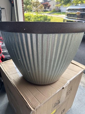 [This review was collected as part of a promotion.] I didn’t pay attention to the measurements when I got this, so I was surprised how large it was when it arrived. Will be perfect for a few different plants, or even a small tree. It’s resin, so feels plastic-y but looks like corrugated metal on the outside. Overall sturdy and really attractive.