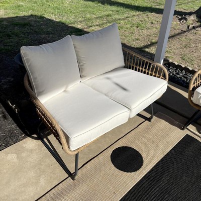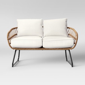 A: The loveseat offers a chic and bold aesthetic with its white steel frame and beige wicker details.