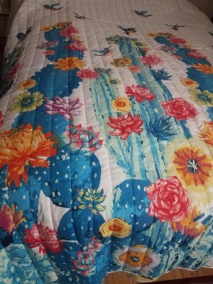 Add bright colors and energy to your home with the Lush Decor Southwest Vibrant Cactus Reversible Quilt Set. The desert-inspired design features a garden of cactus plants on the bottom, growing up towards the top of the quilt. A merry mix of cactus plants create a lively and colorful habitat with big beautiful flowers blooming all over. You can also see hummingbirds flying throughout and above the gardenscape. Enjoy two stylish looks in one set! Simply flip this quilt over to reveal an Aztec-inspired stripe pattern. Switch up your primary or guest bedroom decor as often as you'd like with this western bedding set. This 3 piece colorful bedding set includes 1 reversible quilt and 2 pillow shams. Crafted from a soft microfiber fabric, this cactus quilt set offers softness and comfort. The lightweight polyfill filling is perfect for any season, and even makes this a great layering piece. STANDARD 100 by OEKO-TEX® certified, all components have been tested and certified free from harmful substances. To care for this bedding set, simply machine wash cold on the gentle cycle and tumble dry low. Use a steamer to remove wrinkles, if needed.